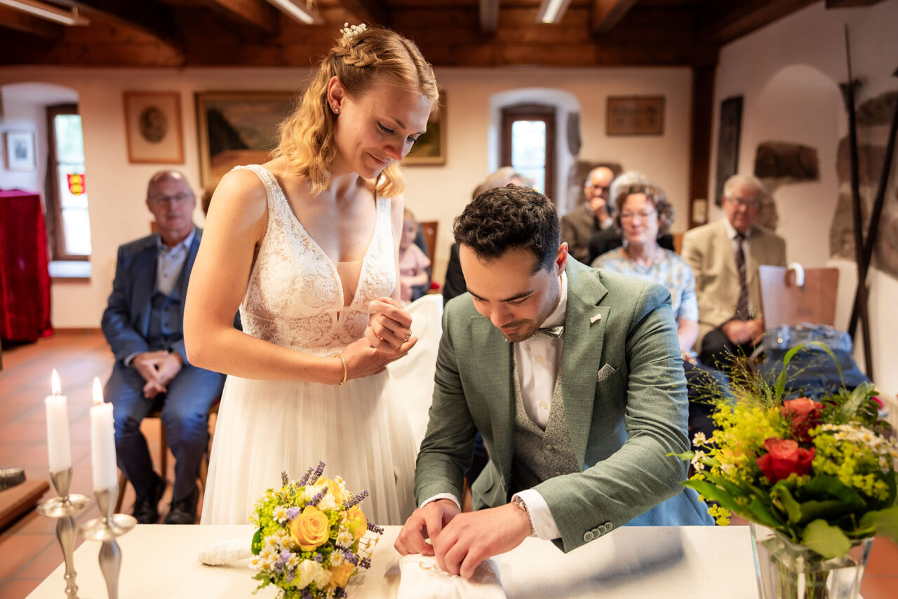 Als Hochzeitsfotograf in Lörrach durfte ich eine wunderschöne, intime Hochzeit auf der beeindruckenden Burg Rötteln begleiten. Die zweistündige Begleitung begann mit der standesamtlichen Trauung in den historischen Gemäuern der Burg. Es war ein emotionaler Moment, den das Brautpaar mit ihren engsten Freunden und Familienmitgliedern teilte. Nach der Trauung folgten die Gruppenfotos vor der beeindruckenden Kulisse der Burg.