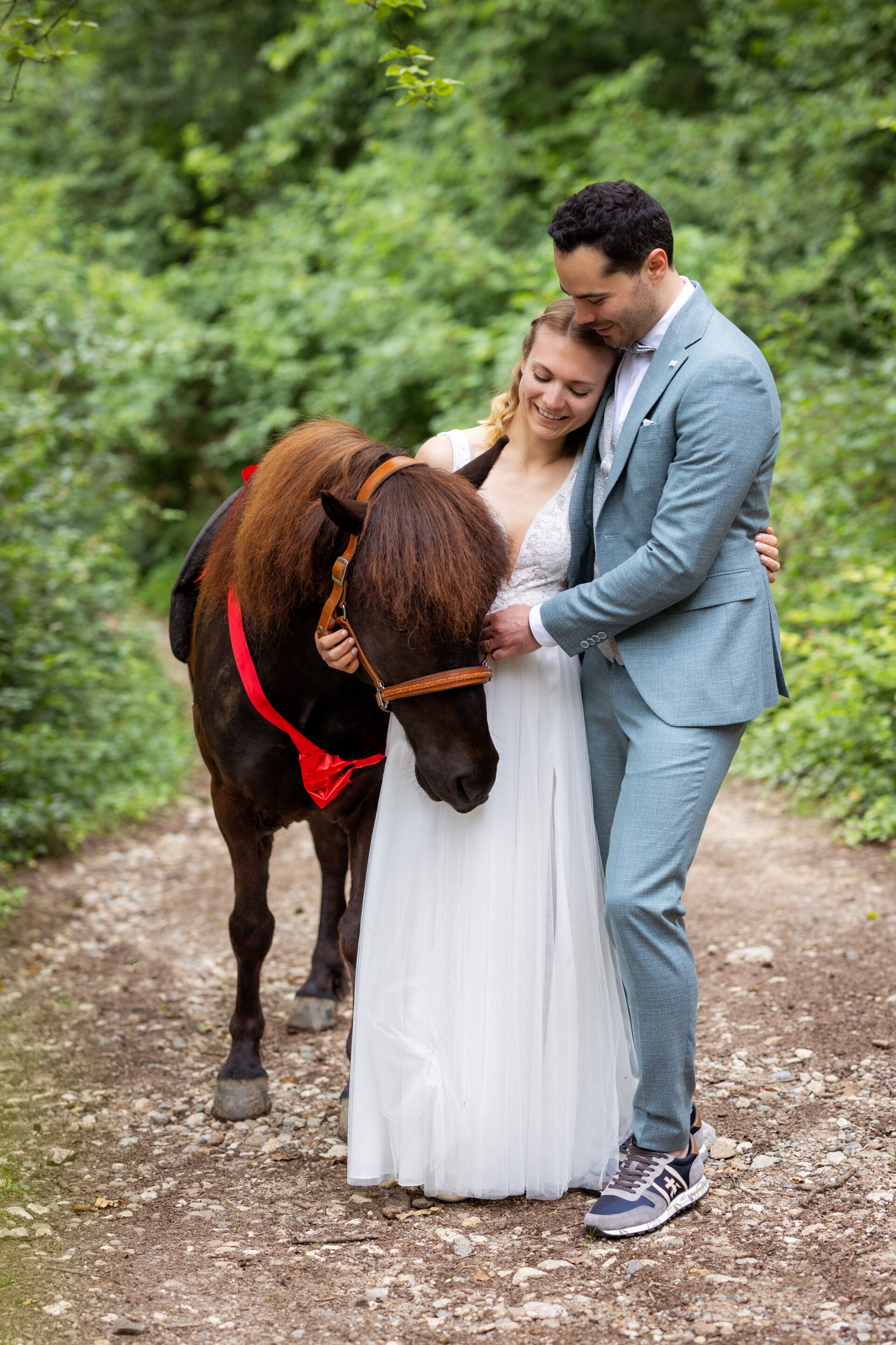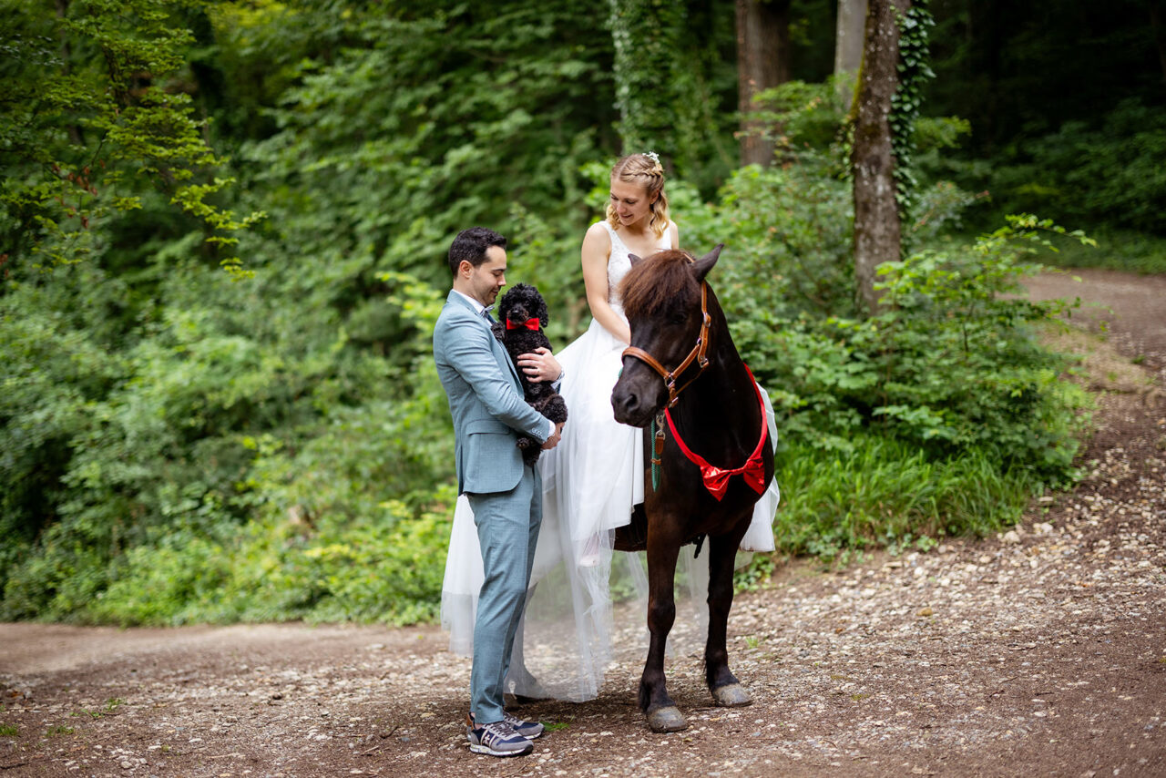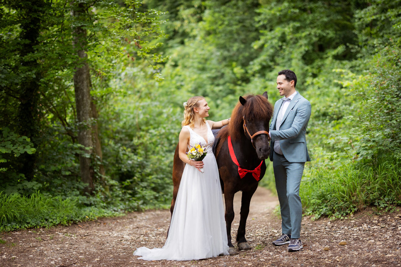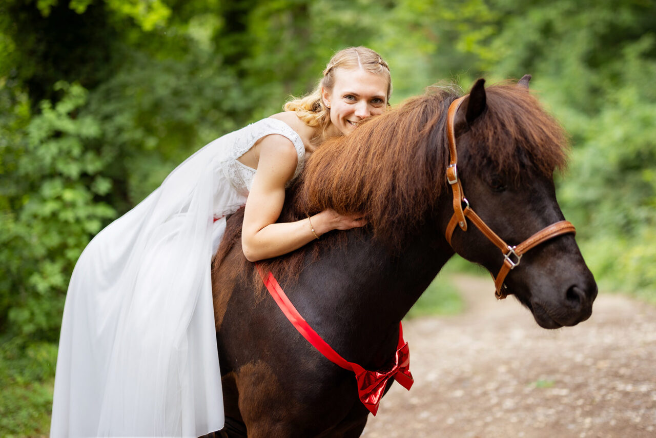 Im Anschluss hatten wir ein besonderes Paarshooting, das die Individualität und den Charme des Paares perfekt widerspiegelte. Wir nutzten die malerischen Ecken der Burg und die ruhige Atmosphäre des umliegenden Waldes, um authentische und romantische Bilder zu schaffen. Ein Highlight war das Shooting mit dem Pony der Braut, das die persönliche Note des Tages unterstrich und wunderschöne, einzigartige Motive entstehen ließ.